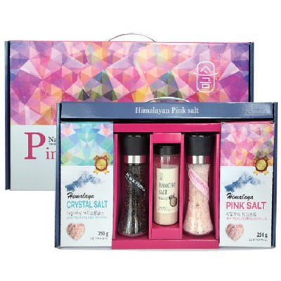 | 기타사항 | •구성품: 그라인더핑크소금80g / 그라인더통후추38g / 핑크솔트300g / 핑크소금파우치250g / 크리스탈소금파우치250g •1C/T = 10ea •size = 51.5X26X7 |